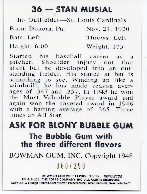Here is the back, which includes the serial number out of 299. Not the rarest Musial card by any means, but I was not expecting to find a serial numbered of The Man when I walked in the door of the card shop.